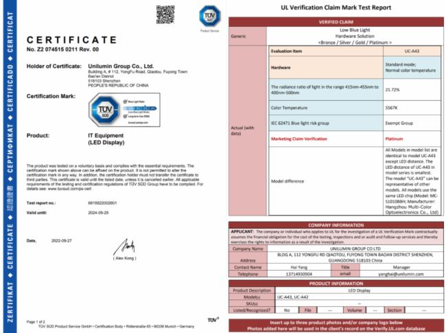在電影放映市場,影院熒幕的視效呈現是否震撼,觀影是否健康,是大多數觀眾關心所在。洲明UCine LED全系列產品現已獲得國際獨立第三方檢測、檢驗和認證機構TüV南德(2022年9月)、美國UL(2023年8月)雙平臺頒發的“低藍光、無頻閃認證證書”。