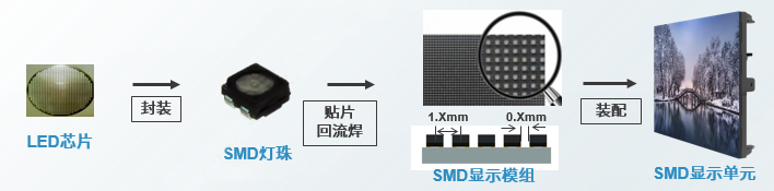 SMD技術路線是將發光芯片(晶圓)封裝成燈珠,把燈珠焊接到PCB板上形成單元模組,最后拼接成一整塊LED屏;
