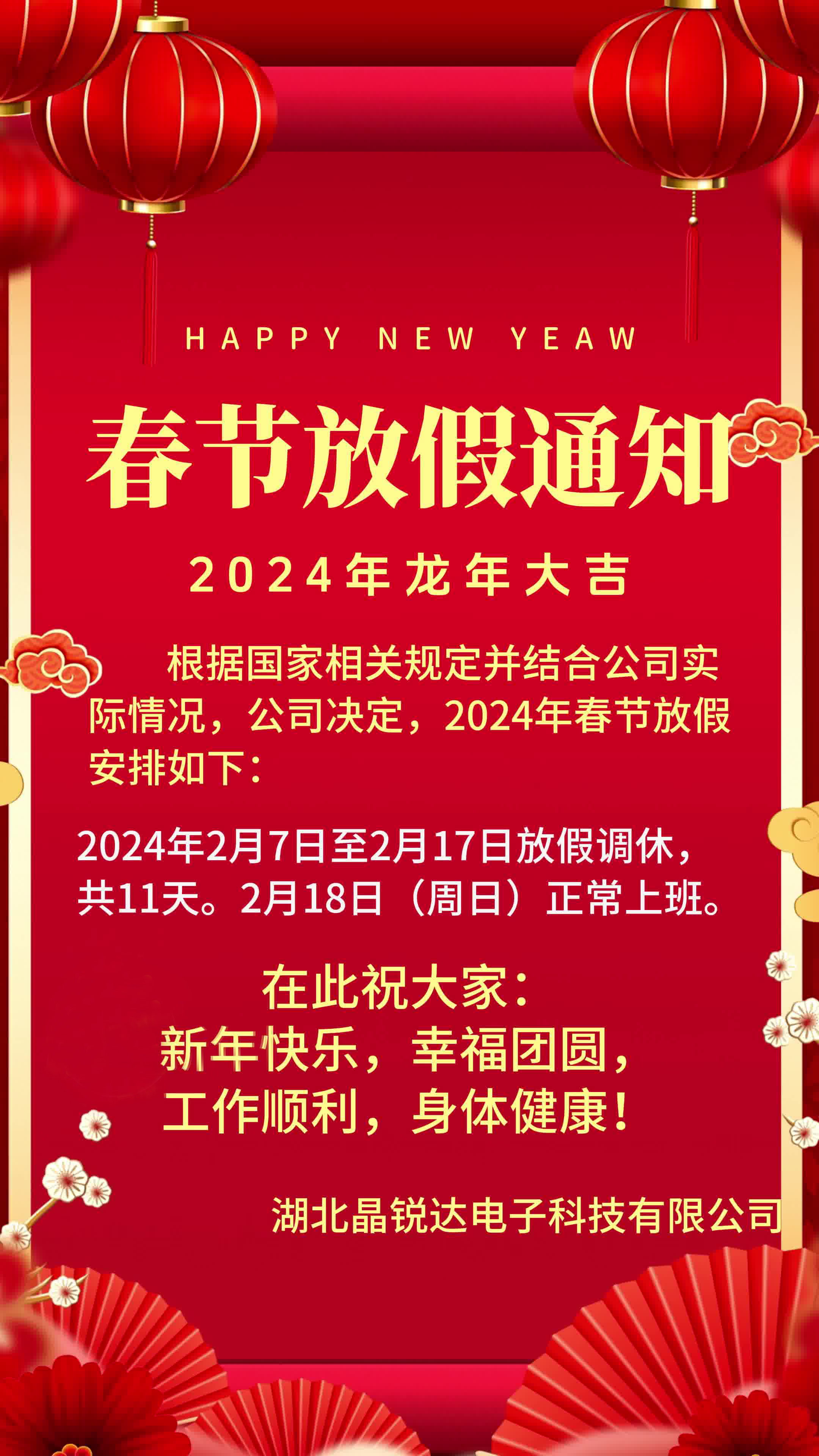 根據國家相關規定和結合公司實際情況,公司決定,2024年春節放假安排如下,在此湖北晶銳達電子科技有限公司祝大家新年快樂,幸福團圓,工作順利,身體健康!