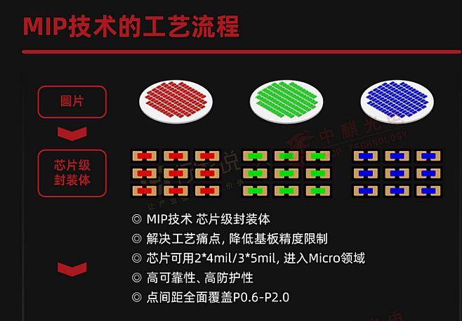 MIP(Mini/Micro LED in Package)封裝技術是一種將Mini/Micro LED芯片進行芯片級封裝的技術,通過切割成單顆器件,分光混光等步驟完成顯示屏的制作。